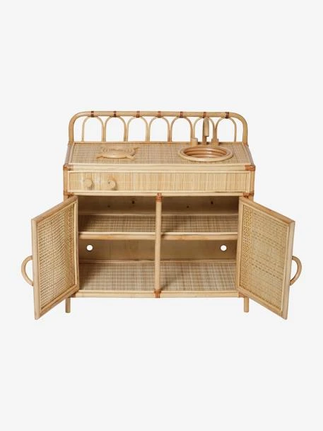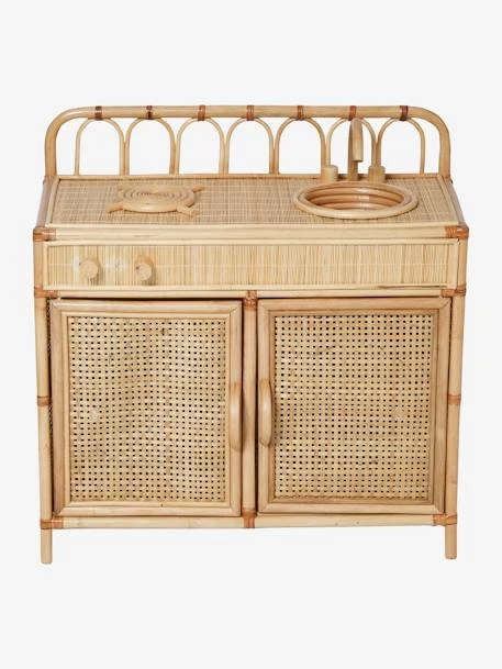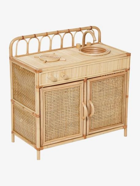 Vous craquez pour la tendance rotin et vous souhaitez faire un enfant heureux ? Alors notre cuisinette est juste parfaite ! Elle se compose sur le dessus d’un évier avec 2 boutons (eau chaude et eau froide) qui tournent au niveau du robinet, d’une plaque de cuisson et de deux boutons qui tournent pour “allumer” la plaque. En dessous, les enfants pourront ranger tous leurs ustensiles dans les grands placards avec étagère. Idéale pour créer un espace cuisinette 5 étoiles à votre enfant, notre jolie cuisinette en rotin est un élément déco à part entière dans votre intérieur.