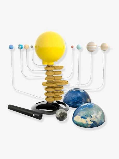 Contient : 1 Soleil, 2 dômes Terre, base, tige centrale, 15 engrenages, 8 tiges, 8 planètes, Lune et lampe.
